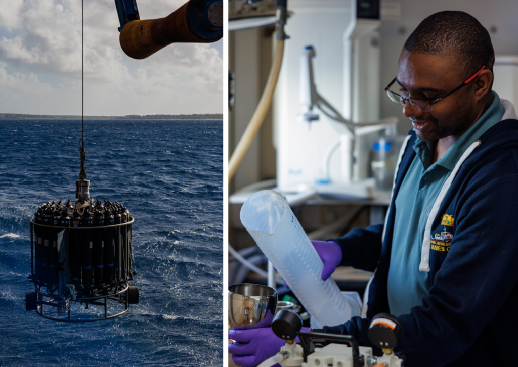 Left: CTD device being deployed Right: Justin Porter from Cayman Islands DoE filters water and collects samples from the CTD machine. Photo Lawrence Eagling/Blue Belt Programme