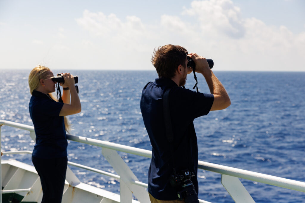 Matt Southgate and Jane Haakonsson, seabird experts from Cayman Islands DoE on the bridge balcony of the James Cook observing seabirds. Photo Lawrence Eagling/Blue Belt Programme.