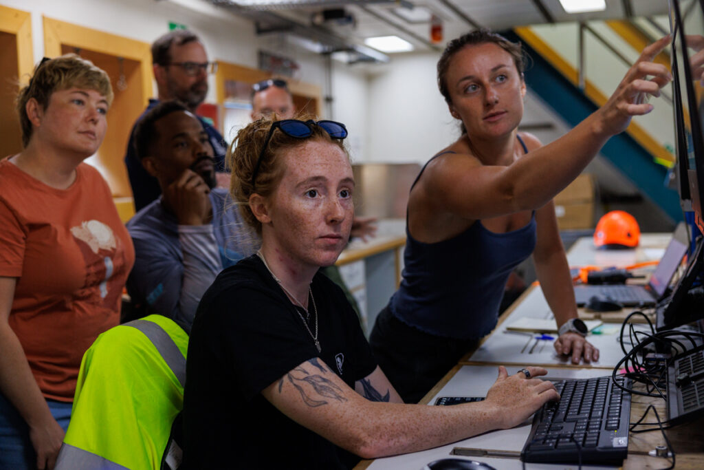 Meghan Ehman, Reef Conservation Assistant, from the Cayman Islands DoE reviews tow camera footage with the team. Photo Lawrence Eagling/Blue Belt Programme.