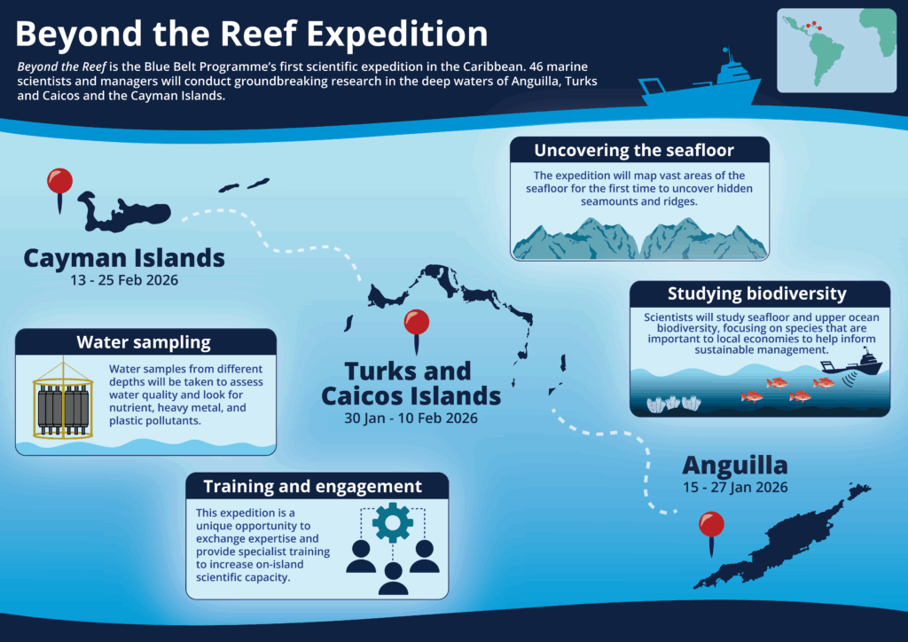 In January 2026, the Blue Belt Programme will set sail from the Dominican Republic to the Territories of Anguilla, Turks and Caicos, and the Cayman Islands. This is the first expedition to the Caribbean in the 10-year history of the programme. Over six weeks, a team of 46 marine scientists on board the RRS James Cook will study the previously uncharted waters of these islands.